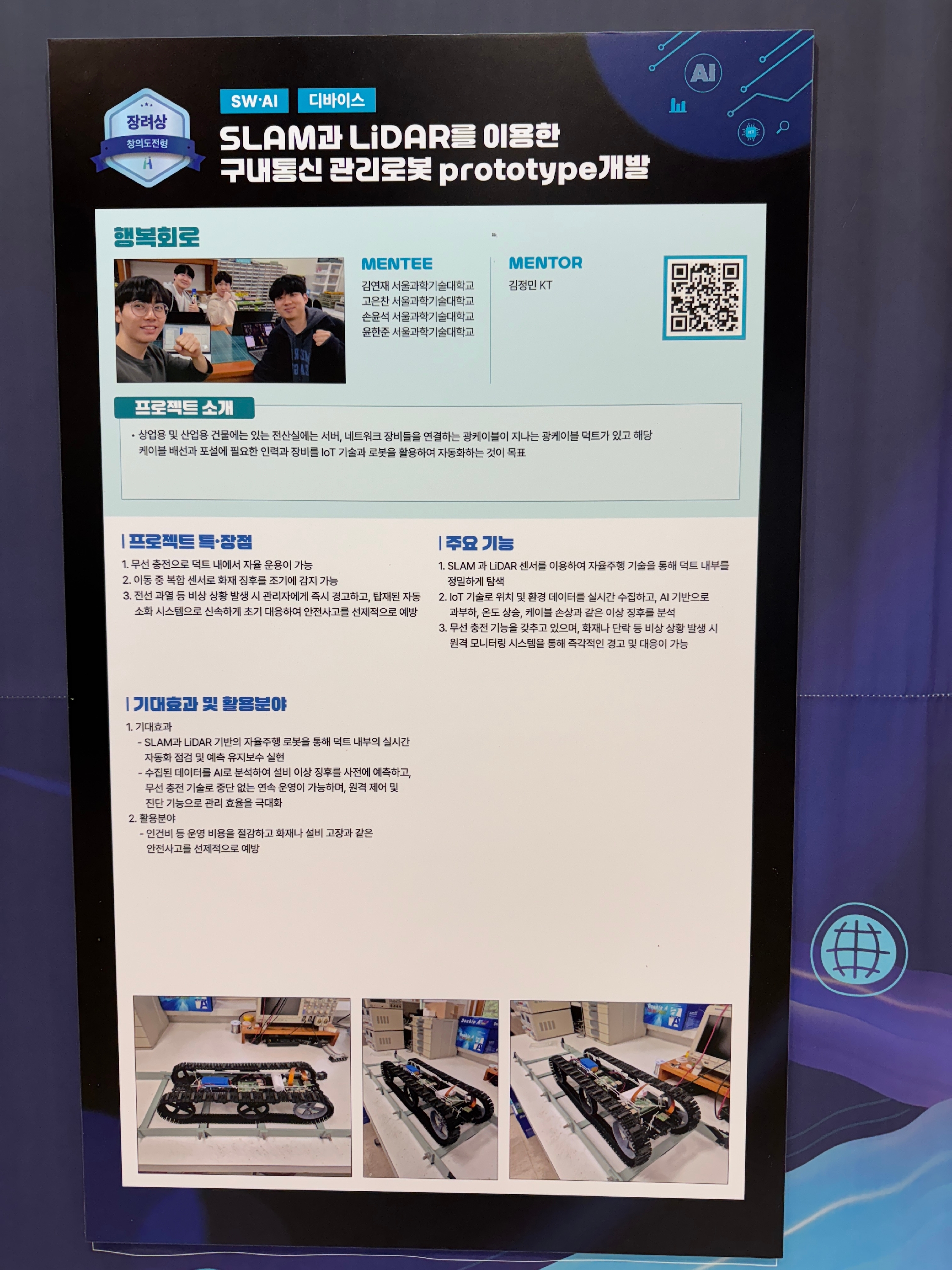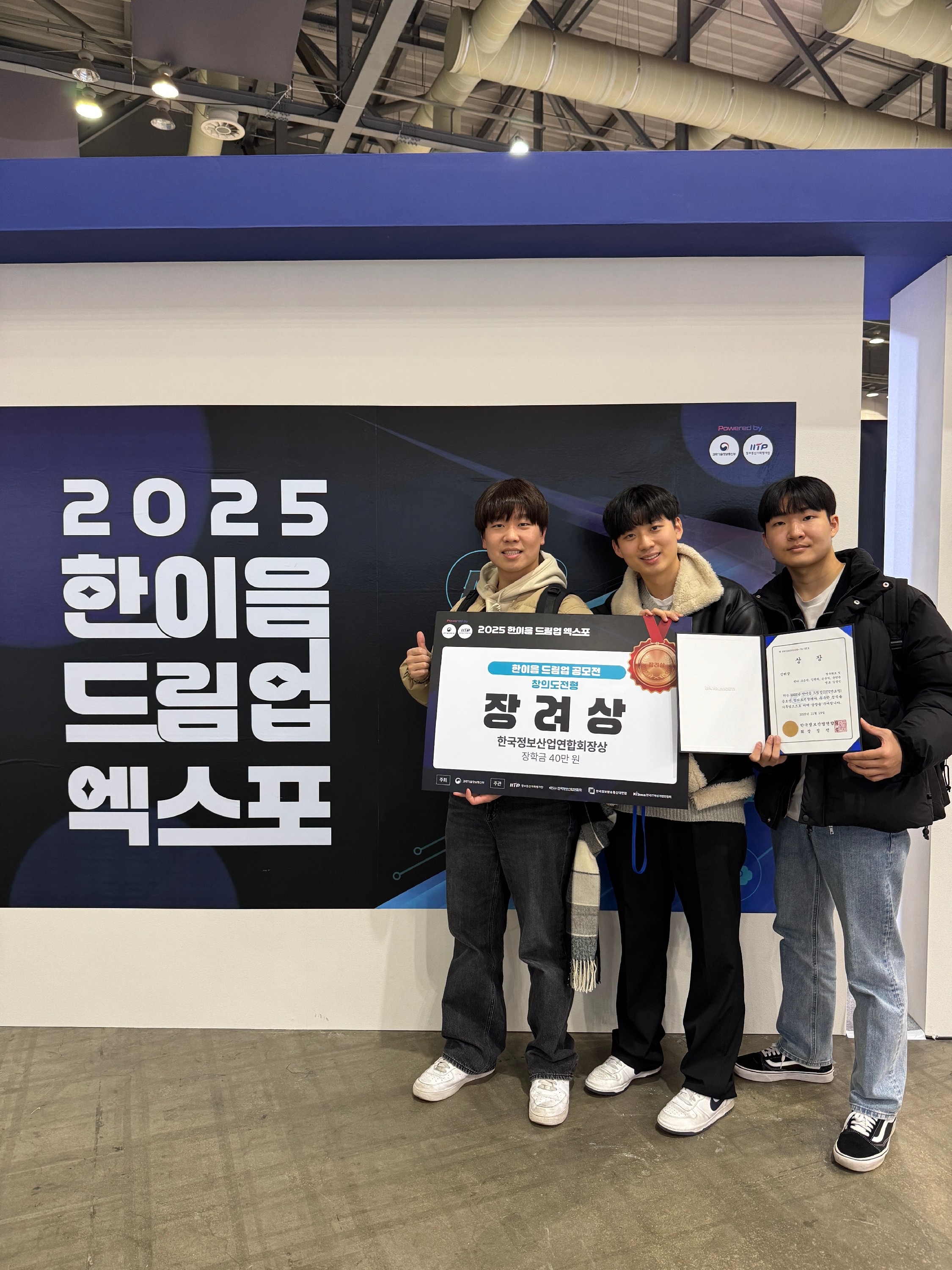 동 팀은 지난 11월 과학기술정보통신부가 주최하고 정보통신기획평가원이 주관한 '2025 한이음 드림업(ICT멘토링) 공모전'에서 'AI 기반 덕트 자율주행 로봇'을 주제로 참여하여 장려상(한국정보산업연합회장상)을 수상하였다.